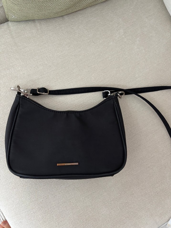 Siyah, sentetik kumaştan yapılmış, kemerli minimalist kadın omuz çantası, trend sokak stili için uygun. Fermuarında ve ambleminde soyulmalar var