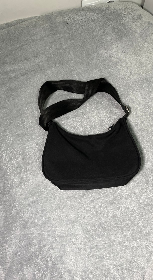 Siyah, sentetik kumaştan minimalist kadın omuz çantası. Düz, desensiz tasarımı ve geniş askısıyla günlük sokak stili için uygun. Zahmetsiz şıklık sunar.