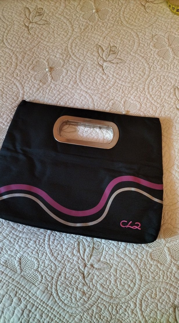 Siyah renkli, baskılı ve fermuarlı kapamalı kadın portföy çanta. Minimalist ve çağdaş tasarıma sahip, sentetik kumaştan üretilmiştir.