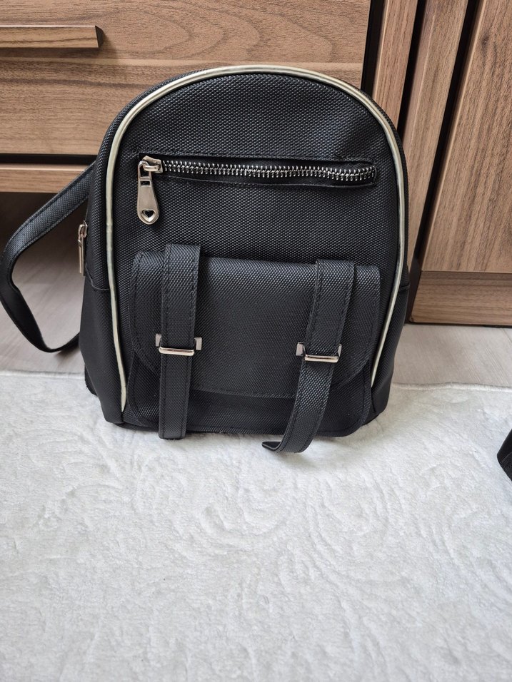 Siyah sırt çantası, tokalı kayışlar ve ön fermuarlı cep içerir. Minimalist tasarımı, gündelik kullanıma ve sokak modasına uygundur.