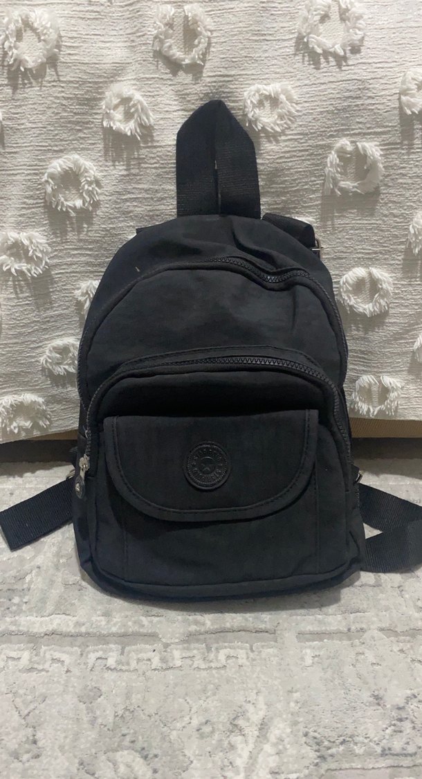 Siyah renkte, tokalı detaylara sahip minimalist kadın sırt çantası. Günlük kullanım için sentetik kumaştan üretilmiştir.