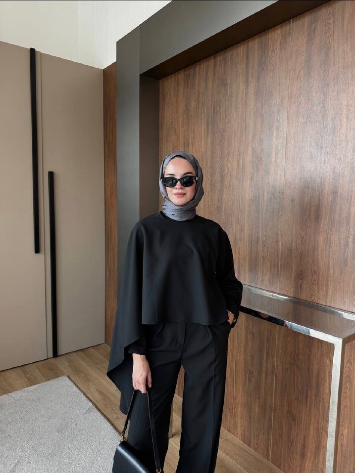 Siyah, yüksek yakalı, uzun kollu, ipeksi kumaştan yapılmış, normal kesim ve midi boyda kadın takımı. Günlük kullanım için zahmetsiz şıklık sunar.