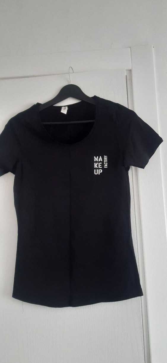 Pamuklu, siyah, kısa kollu ve yuvarlak yaka, göğüste küçük 'MAKE UP' baskılı, minimalist ve sokak stili uyumlu kadın tişörtü.