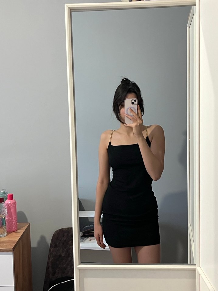 Siyah, düz kesim ve ince askılı bu midi elbise, minimalist gotik tarzda romantik akşamlar için şık ve rahat bir seçimdir. Cam görünümlü kumaşıyla zarif bir dokunuş sunar.