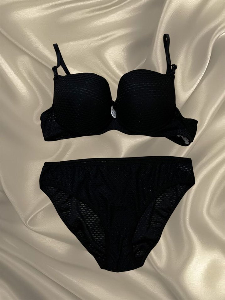 Siyah minimal tarzda, desensiz goth stilinde sütyen ve külot takımı. Sütyenin ayarlanabilir askıları ve midi normal uzunluğu bulunur. bedenler:75-80-85-90