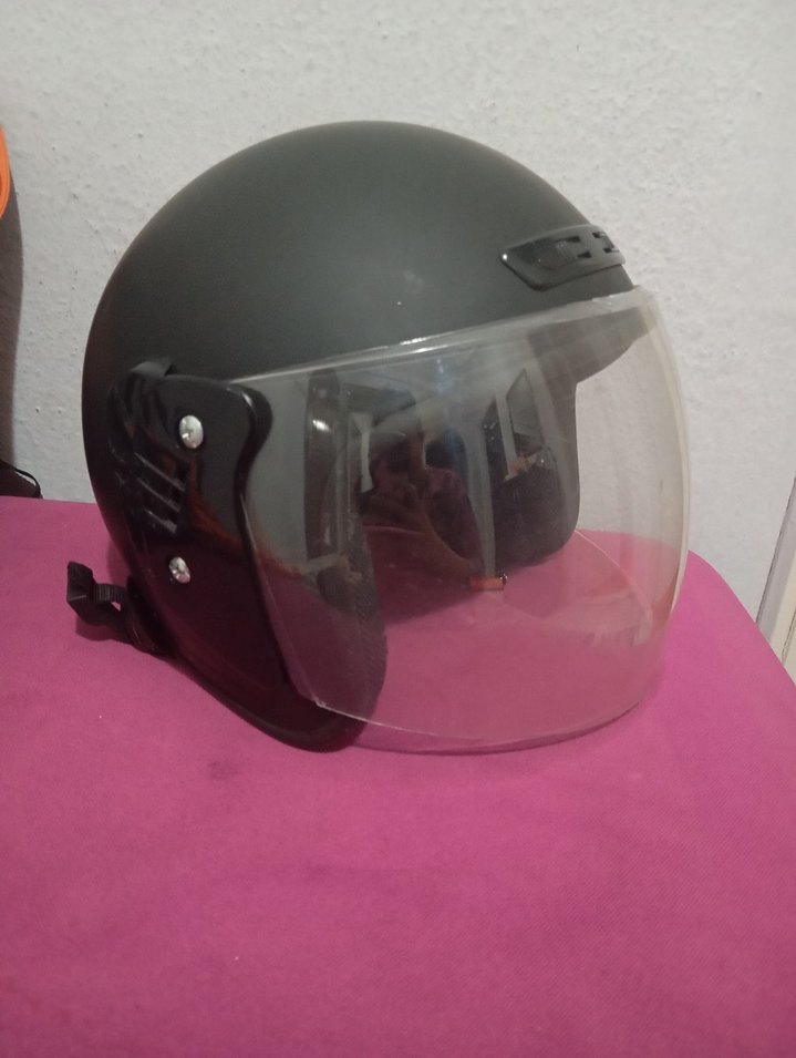 Şeffaf vizörlü, tokalı kayışa sahip siyah minimalist motosiklet kaskı, desensiz ve pürüzsüz yüzeyli.
