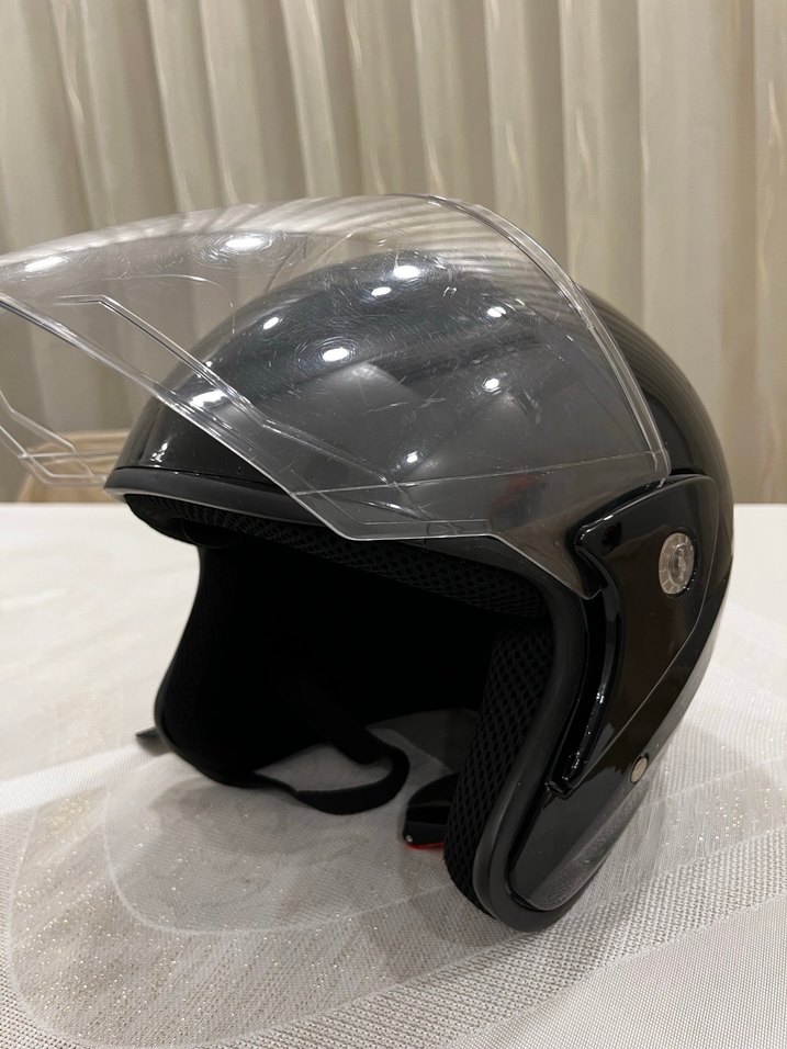 Siyah, minimal tasarımlı motosiklet kaskı, plastik malzemeden üretilmiş ve tokalı kayış ile şeffaf vizöre sahip. Tek renk ve sade görünümlü.