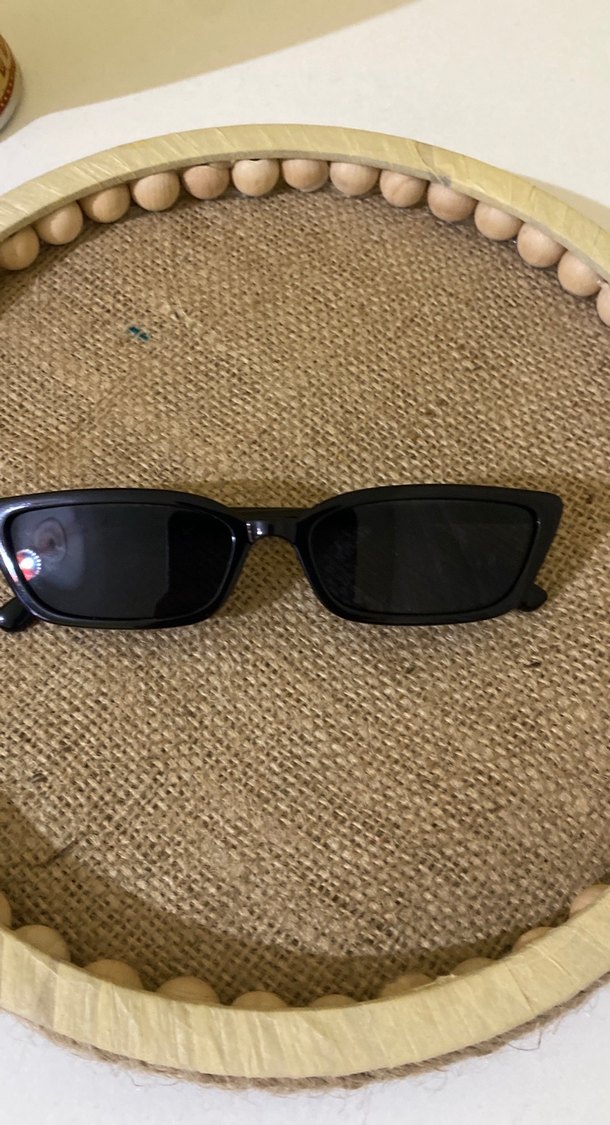 Siyah, minimalist, dikdörtgen çerçeveli retro tarzda kadın güneş gözlüğü. Bohem ve hippie stillerine uyumlu, zahmetsiz şıklık sunar. ️
