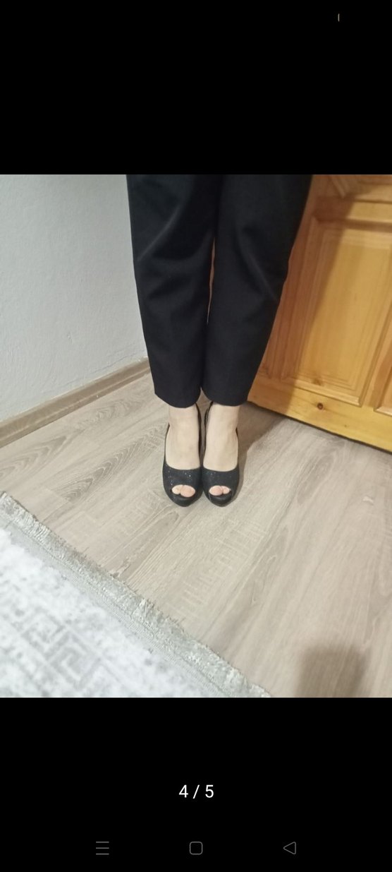Siyah platform topuklu, stiletto topuklu ve önünde yırtmaç bulunan kauçuk malzemeden yapılmıştır. Minimalist, desensiz tasarım, günlük kullanım için uygundur. ürün bir kez giyildi etiketi bile altinda