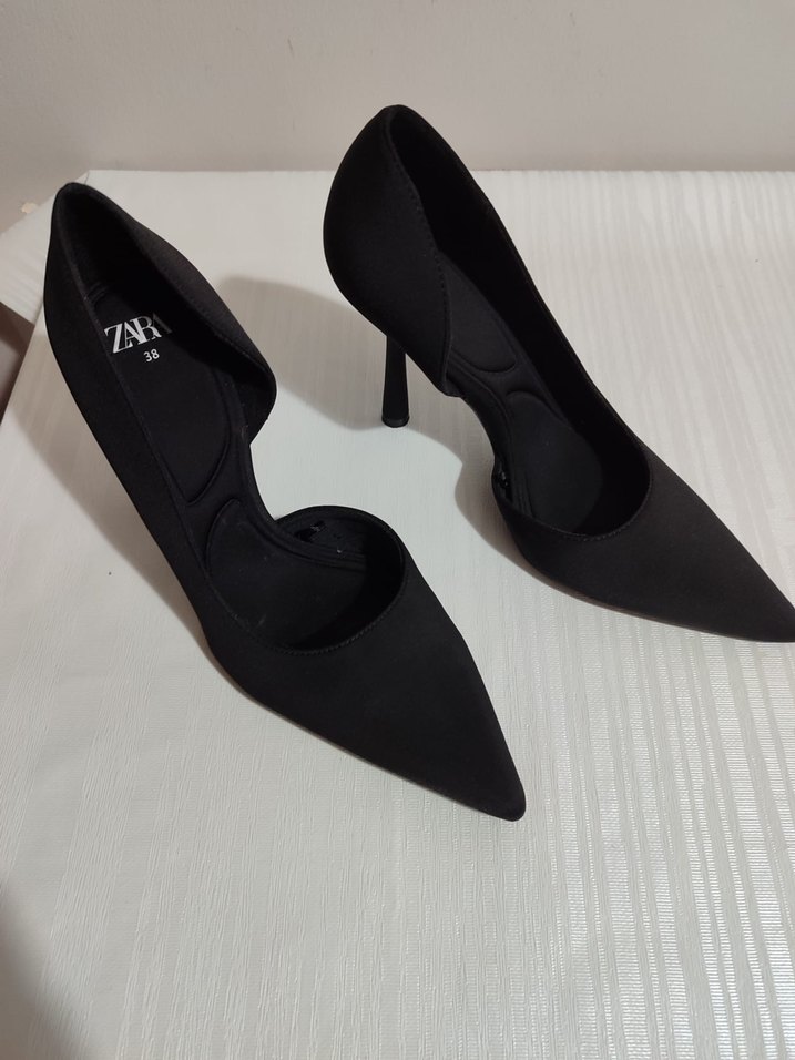 Siyah, minimalist tasarımlı stiletto topuklu ayakkabı. Baskılı desen ve kauçuk materyal kullanılmıştır. Ofis için çağdaş ve zahmetsiz şıklık sunar. Marka: ZAR.