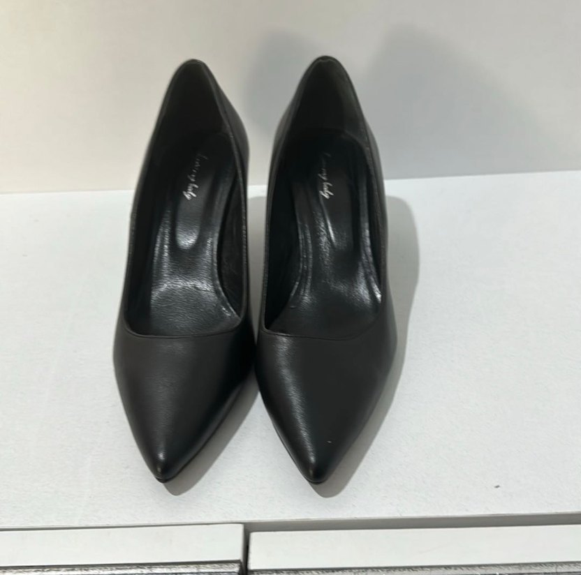 Siyah, minimalist tasarımlı kauçuk malzemeden yapılmış stiletto topuklu ayakkabılar. Ofis için çağdaş ve zahmetsiz şıklık sunar. Hiç kullanılmadı. Topuk boyu 6 cm