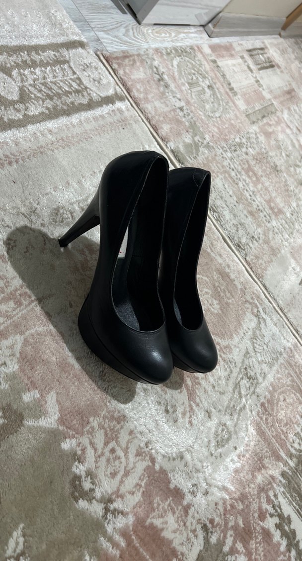 Siyah, desensiz kauçuk malzemeden yapılmış kadın stiletto topuklu ayakkabılar. Cesur, minimalist gotik tarzı ve ofis için uygun, zahmetsiz şıklık sunar.