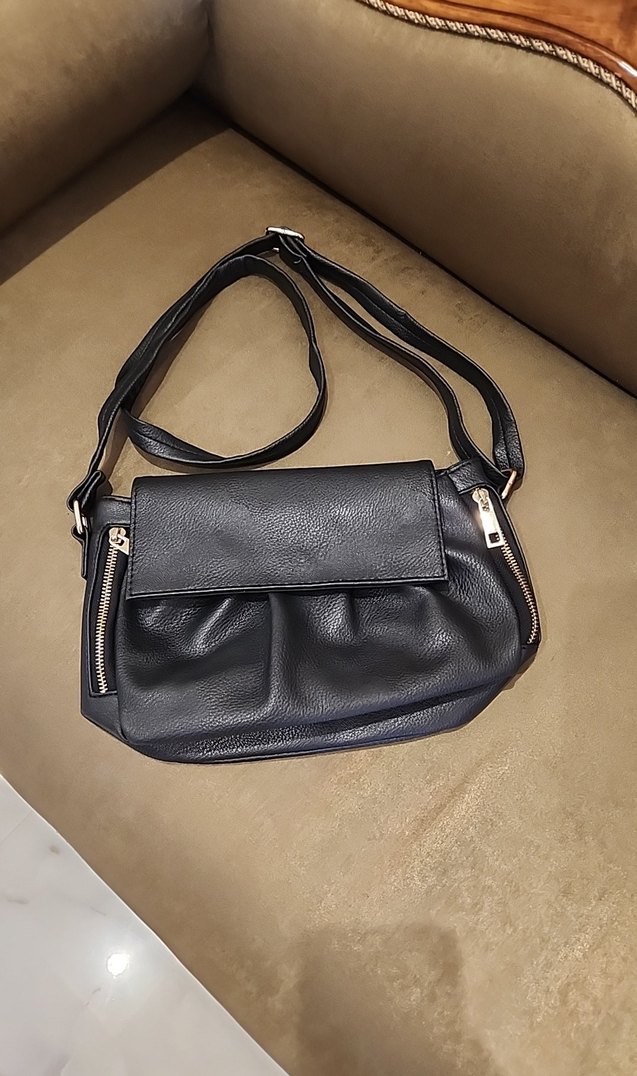 Ayarlanabilir askılı, fermuarlı cepleri olan siyah suni deri kadın çantası, minimalist tasarıma sahiptir ve günlük kullanım için uygundur.