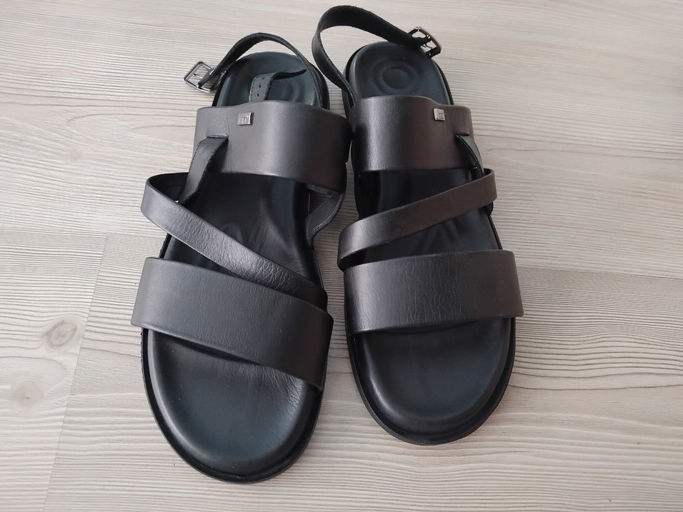 Siyah tokalı bantlara sahip minimalist tasarımlı erkek sandaletleri, günlük kullanım için hakiki deri malzemeden üretilmiştir.Kutusu yoktur.