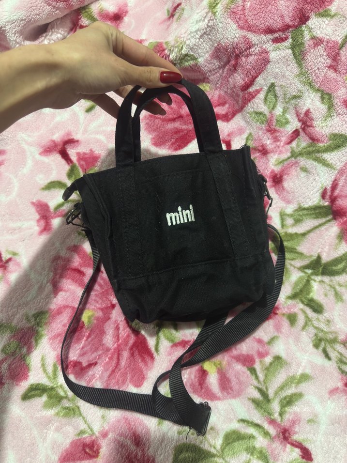 Siyah renkte, 'minl' baskılı, fermuarlı sentetik kumaştan kadın çantası. Minimalist ve rahat sokak stiline uygundur.