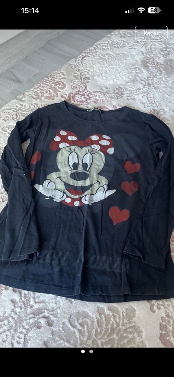 Siyah, uzun kollu, bol kesim kız tişörtü. Önde Minnie Mouse ve kalp baskısı vardır. Pamuklu örme kumaştan, yuvarlak yakalı.