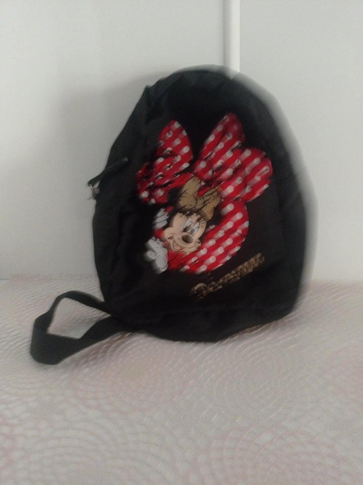 Siyah çocuk yandan asmalı kırmızı puantiyeli büyük Minnie Mouse tasarımı bulunur. Ayarlanabilir omuz askısı ve fermuar kapama vardır.