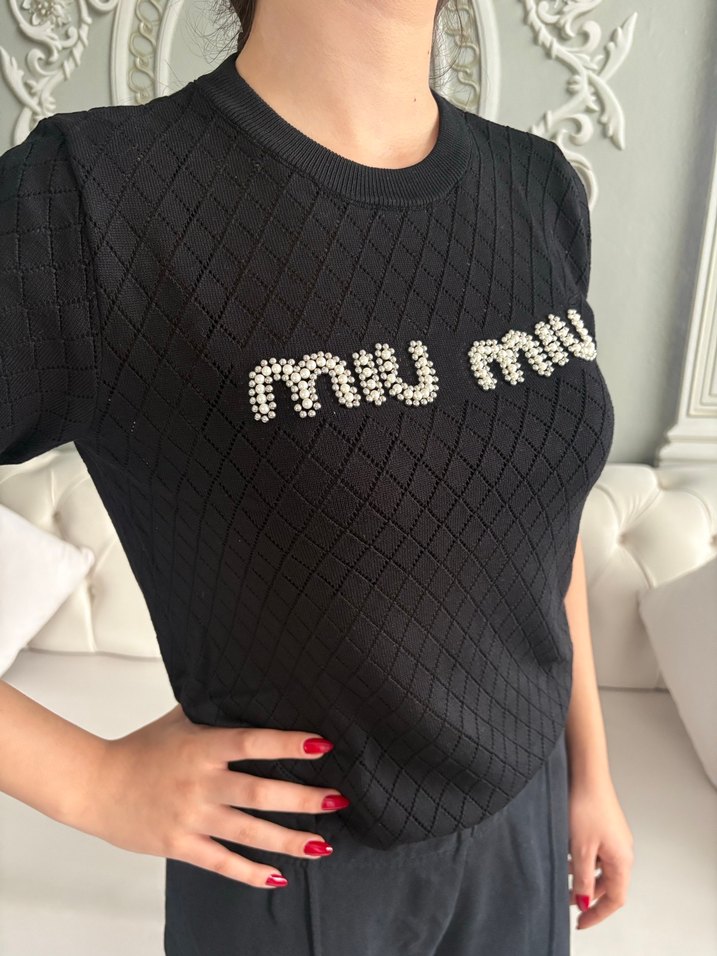 Fitted kesim siyah örme tişört, yuvarlak yaka ve kısa kollu. Dokulu baklava deseni ve inci işlemeli 'miu miu' yazısı ile sokak ve athleisure tarzını yansıtıyor. Günlük kullanım için uygun.