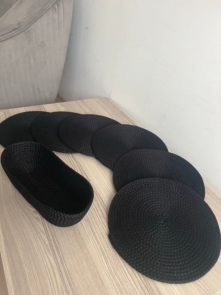 Siyah renkte, dokulu tasarıma sahip modern hasır tabak ve oval kase seti. Masanıza şık ve çağdaş bir dokunuş katmak için ideal. ️