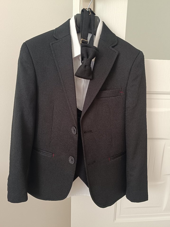 siyah çocuk takım elbisesi, kesimli yaka ve düğmeli ön kısmıyla modern klasik tarzda, Desensiz ve beyaz gömlek, pantolon ile siyah papyon içerir. 7 yaş yazıyor ama 5-6 yaşada uyumlu. Bir kere giyildi