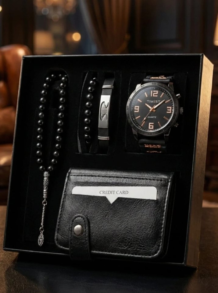 Kredi kartı bölmeli deri kartlık, boncuklu ve metal bilekliklerle birlikte siyah modern klasik erkek saati seti. ⌚