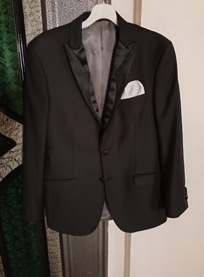 Siyah renkli, klasik yakalı ve düğmeli erkek takım elbise ceketi. Uzun kollu, normal boyda ve ofis için uygun modern klasik tasarım.