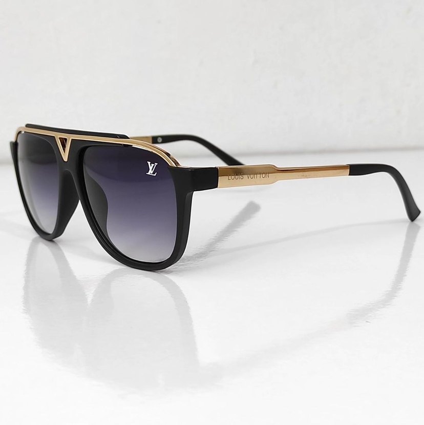 Louis Vuitton'un parlak siyah, şeffaf ve altın detaylı modern klasik tasarıma sahip kadın güneş gözlüğü. Zarif ve zamansız stil.