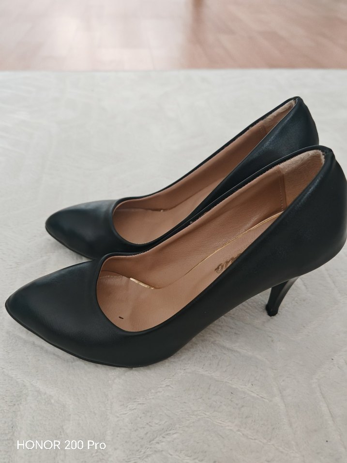 Siyah renkte, kauçuk malzemeden yapılmış modern klasik stilettolar. Ofis için uygun, zahmetsiz şıklık ve klasik zarafet sunar.