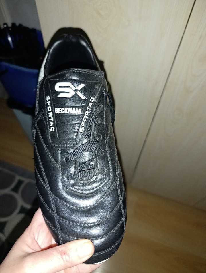 Siyah renkte, tokalı detaylı ve kauçuk tabanlı modern erkek futbol ayakkabısıdır. ⚽
