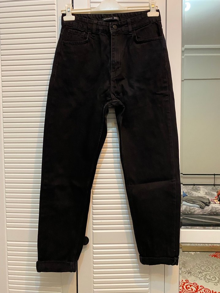 Siyah renkte, mom jean kesim kot pantolon. Denim kumaştan üretilmiş, günlük rahat sokak stili için uygundur. Rahat ve zahmetsiz şıklık sunar. Az kullanıldı. Ürün boyu 95 cm’dir.