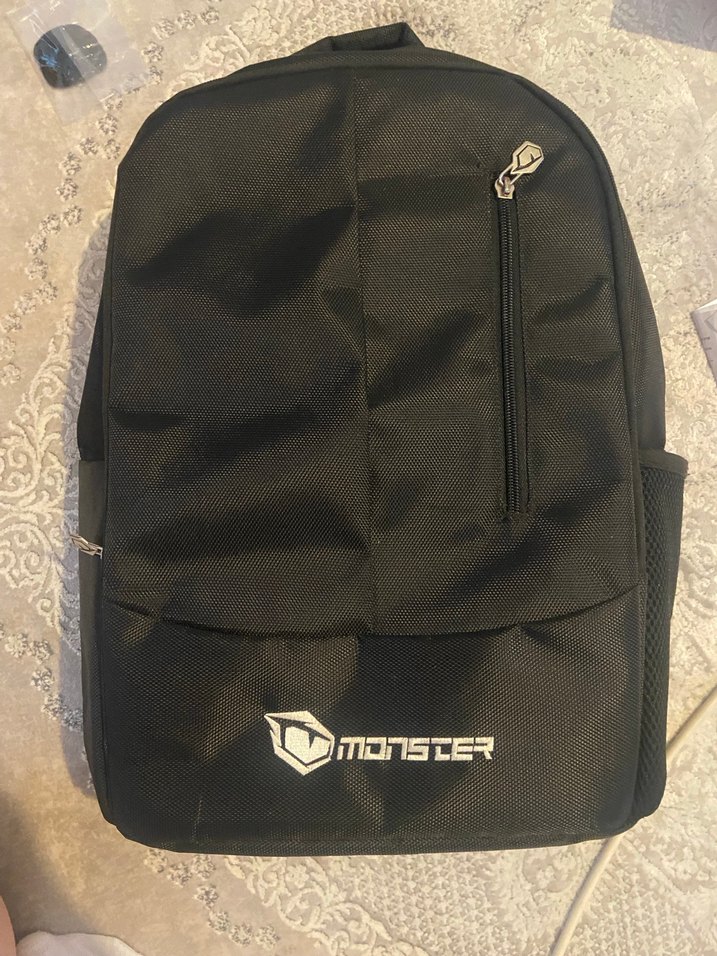 hiç kullanılmamıştır ❗️Siyah renkli, baskılı Monster logosu ve fermuarlı bölmeleriyle minimalist sokak tarzı erkek sırt çantası.