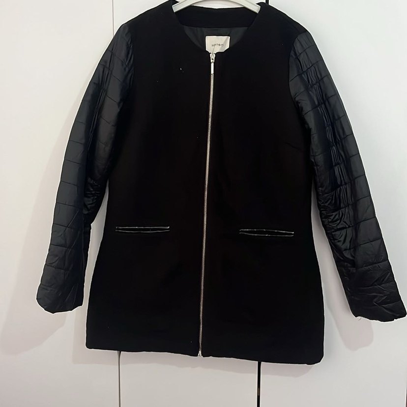 Siyah ceket fermuarlı ön ve uzun kollu olarak tasarlanmıştır. Normal kesim, notched yaka ve midi boy özellikleriyle sokak modası ve Paris tarzını birleştirir. Yumuşak ve sıcak kumaştan üretilmiş, desensiz ve günlük kullanıma uygundur.