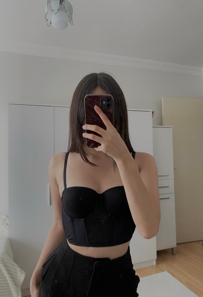 göğüs korsesi. Gotik tarzda, midi boy ve vücuda oturan kesim. Cesur günlük kullanım için uygun.
