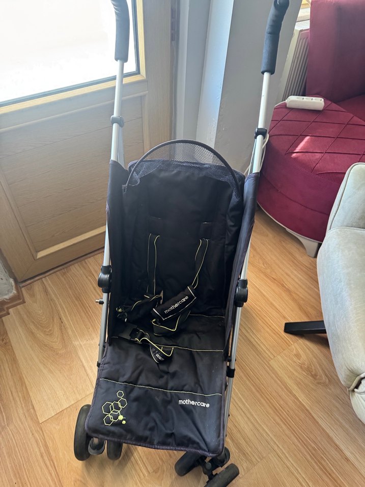Siyah Mothercare bebek arabası, hafif çerçeve ve güvenlik kemeriyle konforlu kullanım sağlar.