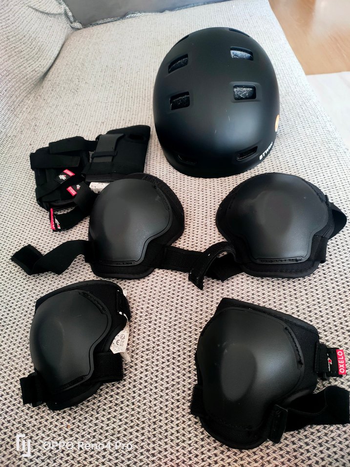 Siyah motosiklet diz koruyucuları, plastik koruma ve Velcro bantlarla athleisure tarzına uygun. Havalandırmalı siyah kask da dahil. ️