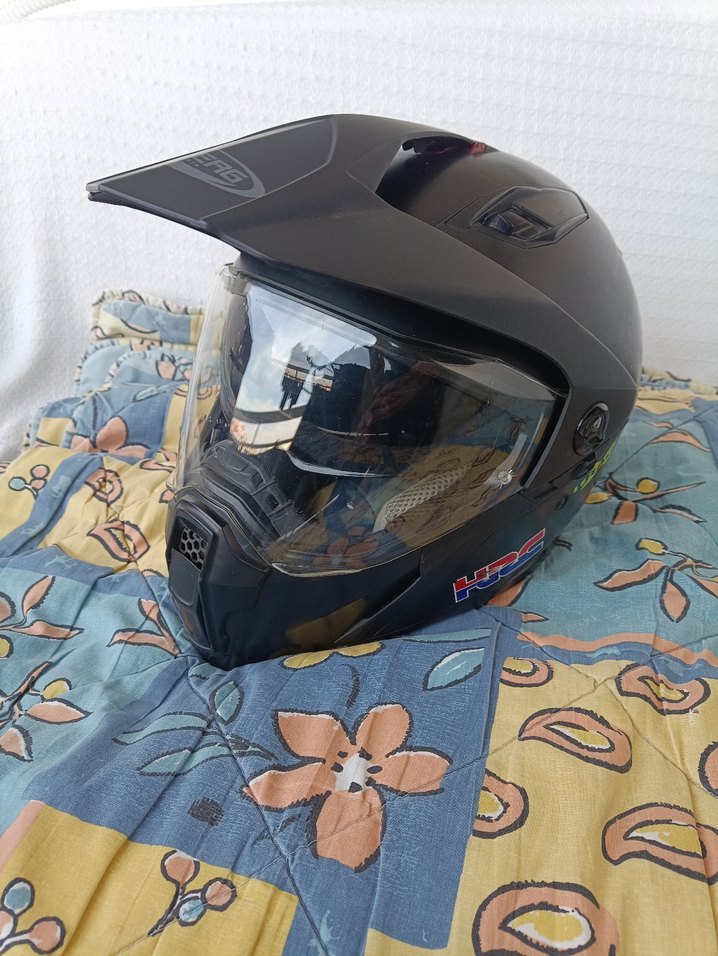 Motosiklet kaskı, koyu renkli baskılı desen ve şeffaf vizörlü. Caberg xtrace modeli kullanmaya bağlı çizikleri vardır fotografları mevcuttur