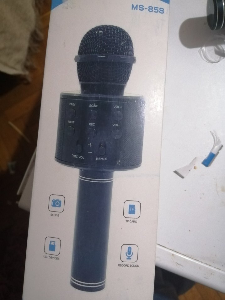 Siyah MS-858 kablosuz mikrofon, ses ve kayıt kontrollerine sahiptir. USB, TF kart destekler ve şarkı kaydı yapılabilir.