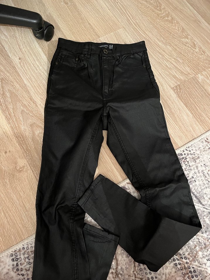 Siyah deri, normal boy ve regular fit kadın pantolon. Tokalı detayı ve sokak stilini yansıtan görünümüyle günlük kullanıma uygundur. Çok hafif aşınması var
