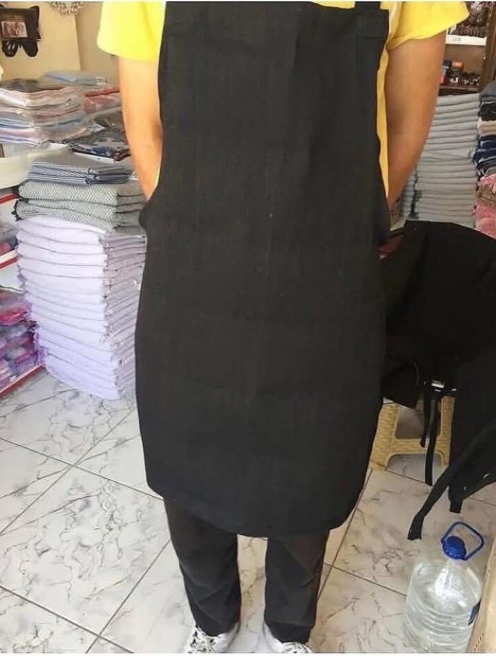 Siyah ve desensiz tasarıma sahip bu mutfak önlüğü, yemek yaparken pratik koruma sağlar. Koyu renkli ve sade görünümlüdür.
