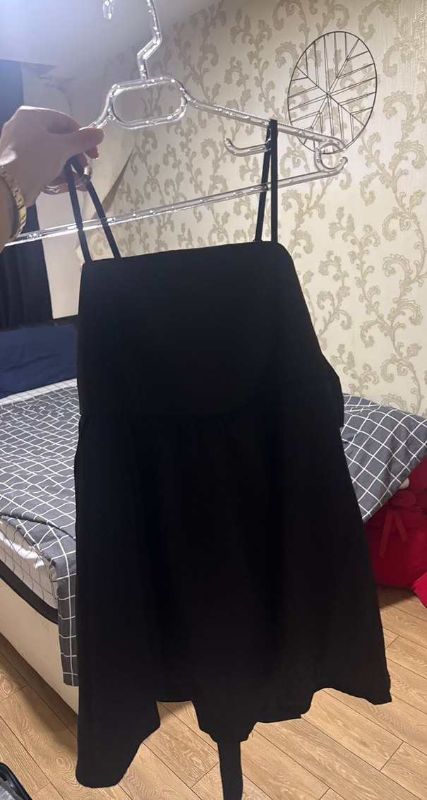 İnce askılı, desensiz siyah mutfak önlüğü, yemek yaparken pratik koruma sağlar.