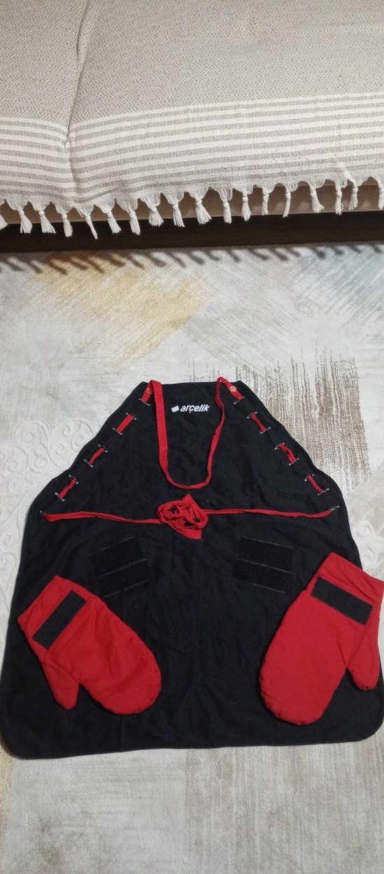 Kırmızı detaylı siyah mutfak önlüğü, yanlardan bağcıklı ayarlanabilir. Üzerinde Arçelik logosu ve kırmızı fırın eldivenleri ile birlikte.Özel üretimdir temiz ve kullanılmamıştır.