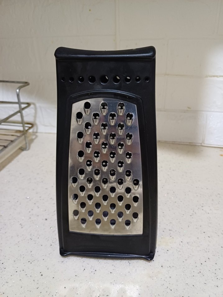 Çeşitli yiyecekleri rendelemek için uygun, sağlam tasarımlı siyah mutfak rendesi. Keskin metal bıçakları koyu çerçeveye yerleştirilmiştir.