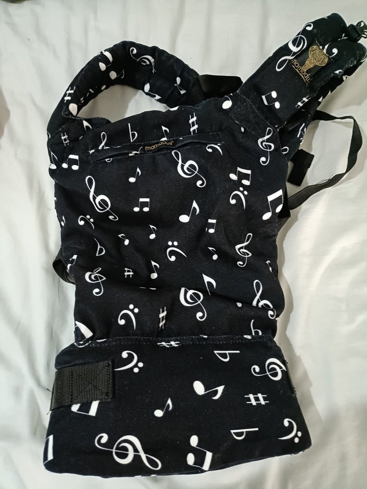 Siyah bebek taşıyıcı, üzerinde beyaz müzik notaları bulunan yumuşak kumaştan yapılmıştır ve bebeği rahat taşımaya olanak sağlar.