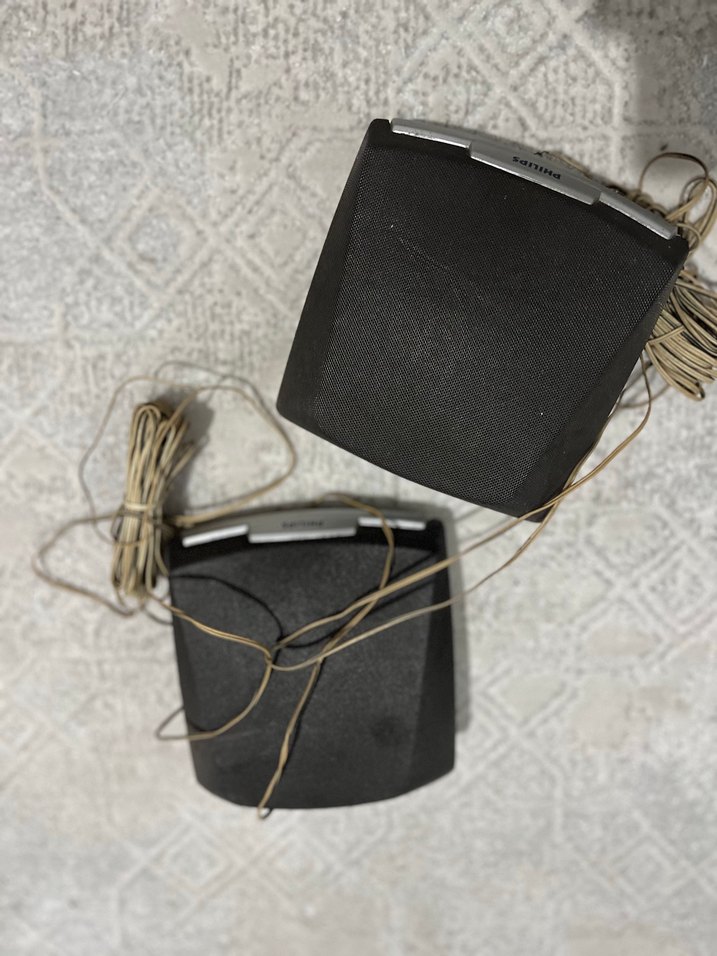 Kablolu bağlantıya sahip siyah müzik sistemi hoparlörleri, net ses çıkışı sağlar.