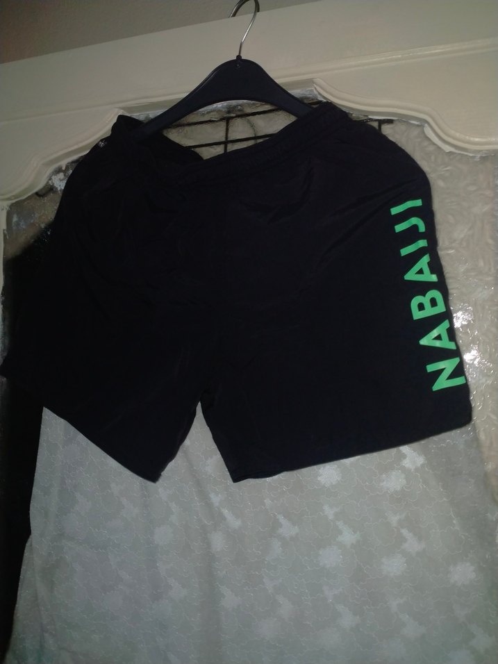 Siyah, Nabaji baskılı, Velcro detaylı, sentetik kumaştan yapılmış bol kesim mini spor şort yüzme şortu♂️