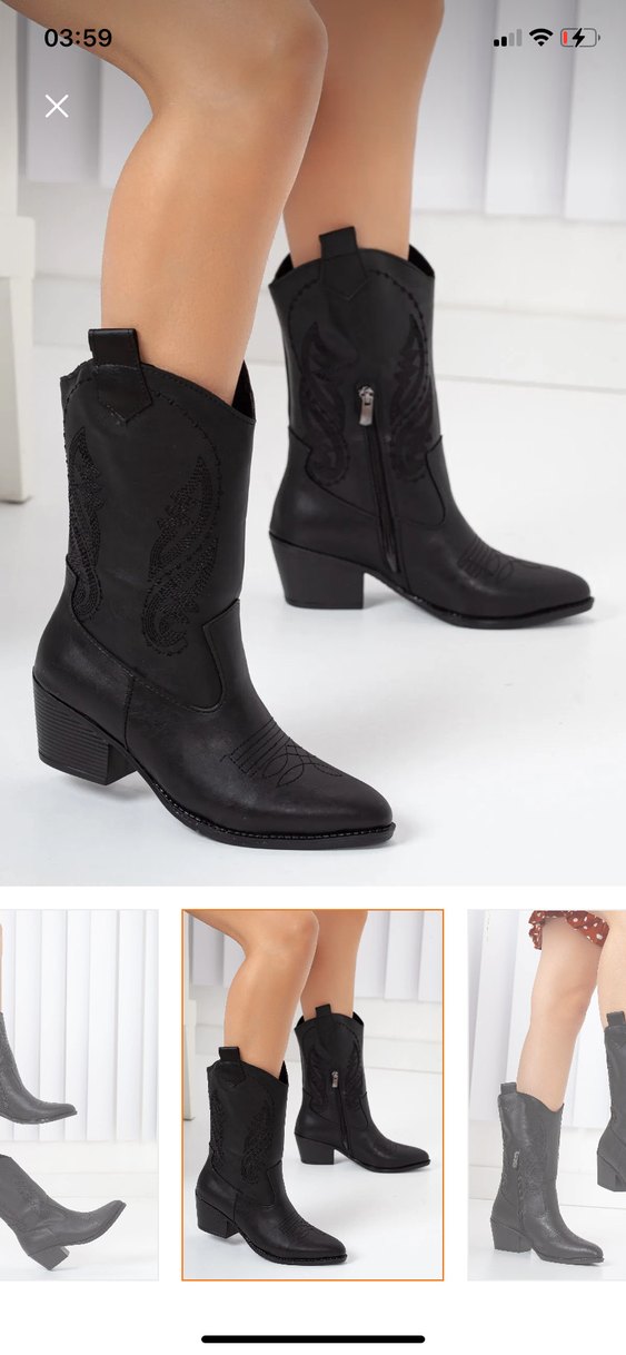 Siyah deri dizüstü botlar, blok topuklu ve nakışlı detaylara sahiptir. Bağcıklı ve yan fermuarlı, günlük kullanıma uygun gotik ve sokak stili karışımıdır.