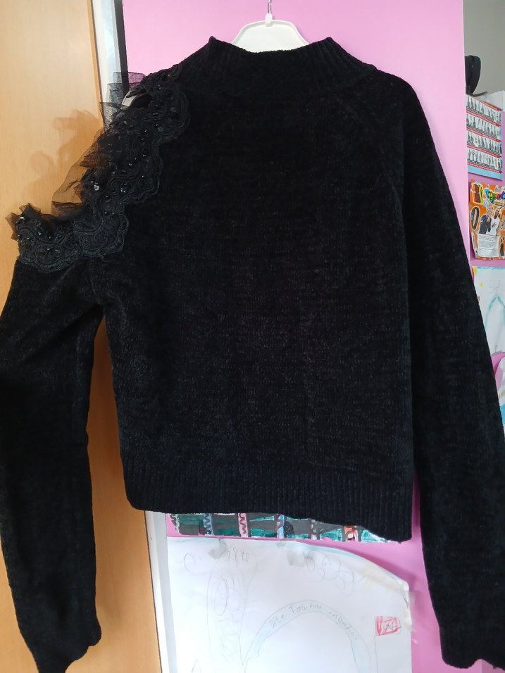 Bu siyah, boğazlı ve uzun kollu kazak, nakışlı detaylar ve bir omuzda dantel süslemeyle gotik ve rahat tarzı birleştirir.