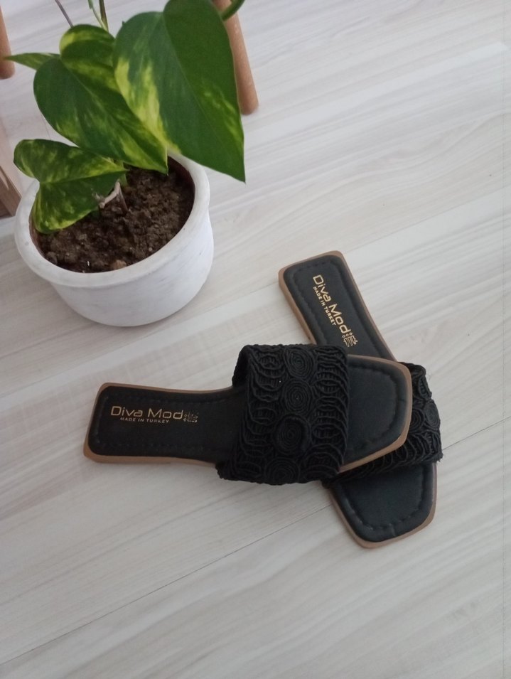 Diva Mod marka, nakışlı desenli siyah bohem tarzı kadın terlik. Cırt cırtlı ve blok topuklu, günlük kullanıma uygun rahat tasarım. hiç kullanılmadı