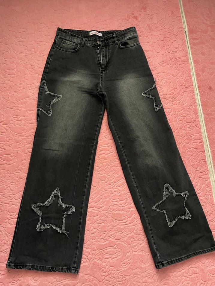 Nakışlı yıldız desenleri ve tokalı bel detayına sahip siyah kot pantolon. Bol kesimi ve midi boyuyla gündelik kullanıma uygun grunge punk tarzını yansıtır. ⭐