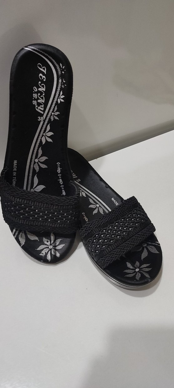 Siyah dolgu topuklu terlikler, nakışlı çiçek desenleri ve dantel detaylara sahiptir, günlük rahat kullanım için kauçuktan üretilmiştir.